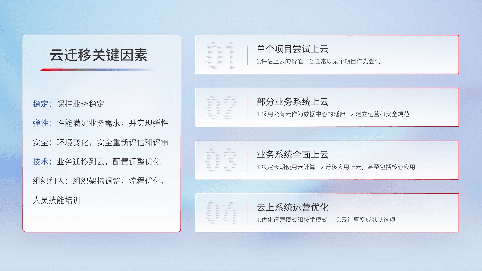 结合实际业务,,从规划设计、、、云平台选型、、、云原生改造、、、、数据迁移、、、集成交付,,,,迁移全过程为客户识别最佳上云路径,,,,做好风险识别管理,,,设计网络架构、、、、身份权限、、、、安全审计合规、、、、操作审计、、、日志审计、、、、监控告警策略、、、、多站点容灾设计等,,,,对云上基础设施进行整体规划,,,提升IT治理水平,,,,以满足弹性、、高可用、、、高性能的需求。。。。