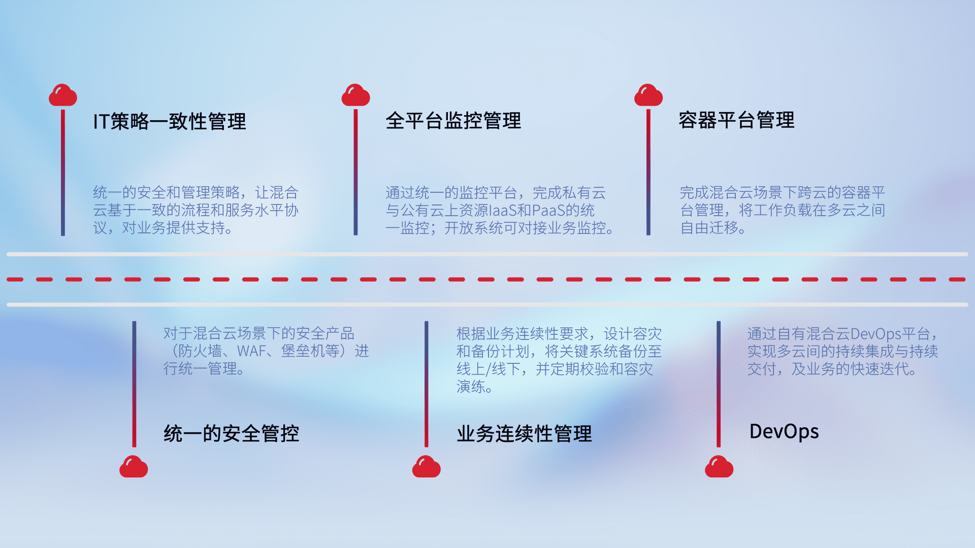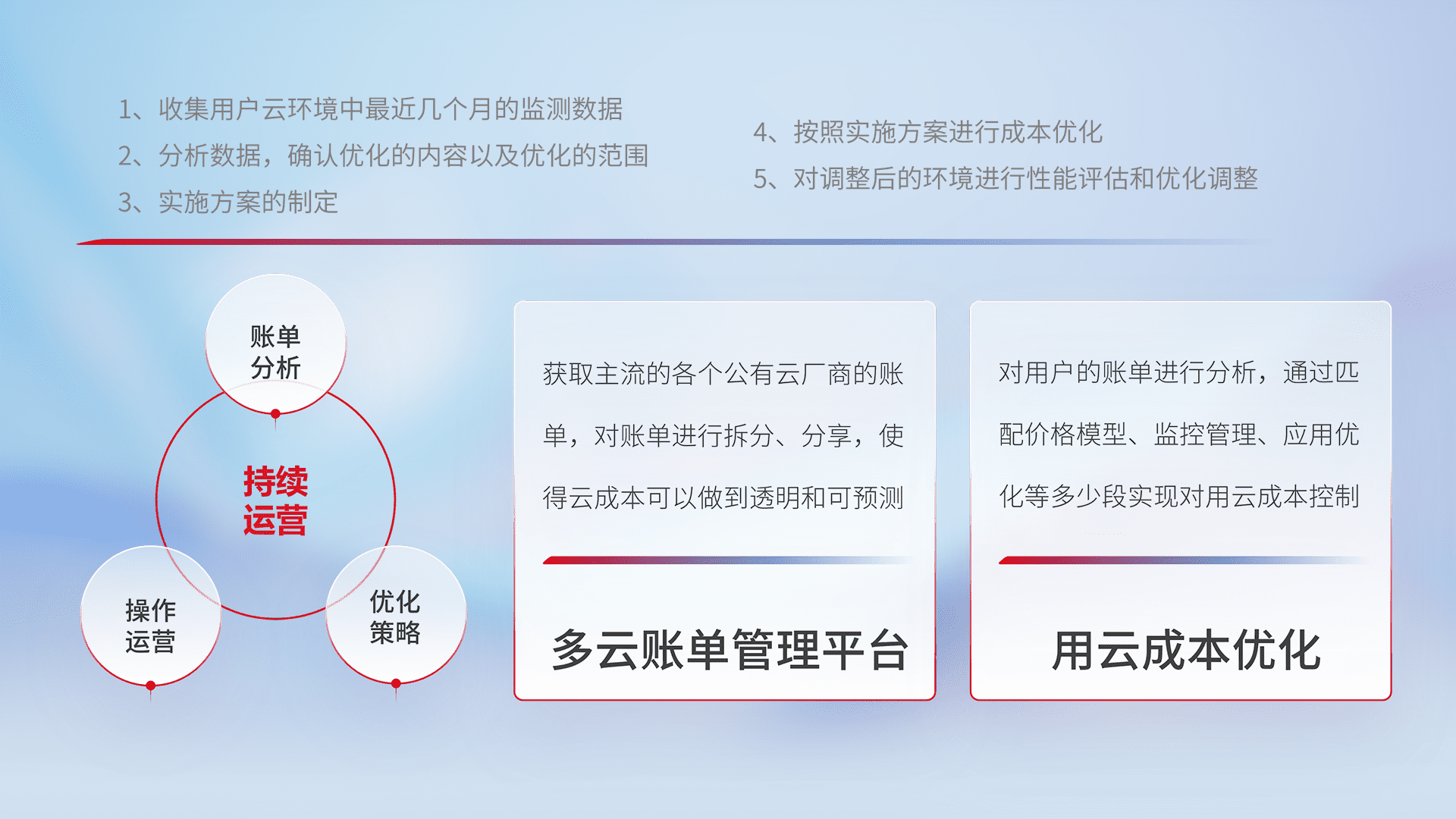 通过多云纳管,,以统一的资源数据模型把客户的云资源进行抽象和封装,,,,进而实现对多云资源的统一操作,,,保障云资源管理的可靠性、、、、稳定性与可用性。。量身定制化运维内容,,配置、、、、开发运维、、、、补丁管理、、备份、、监控、、认证和访问管理、、审计和日常巡检等,,,保障在用云过程中的可靠度,,稳定度以及高可用率。。