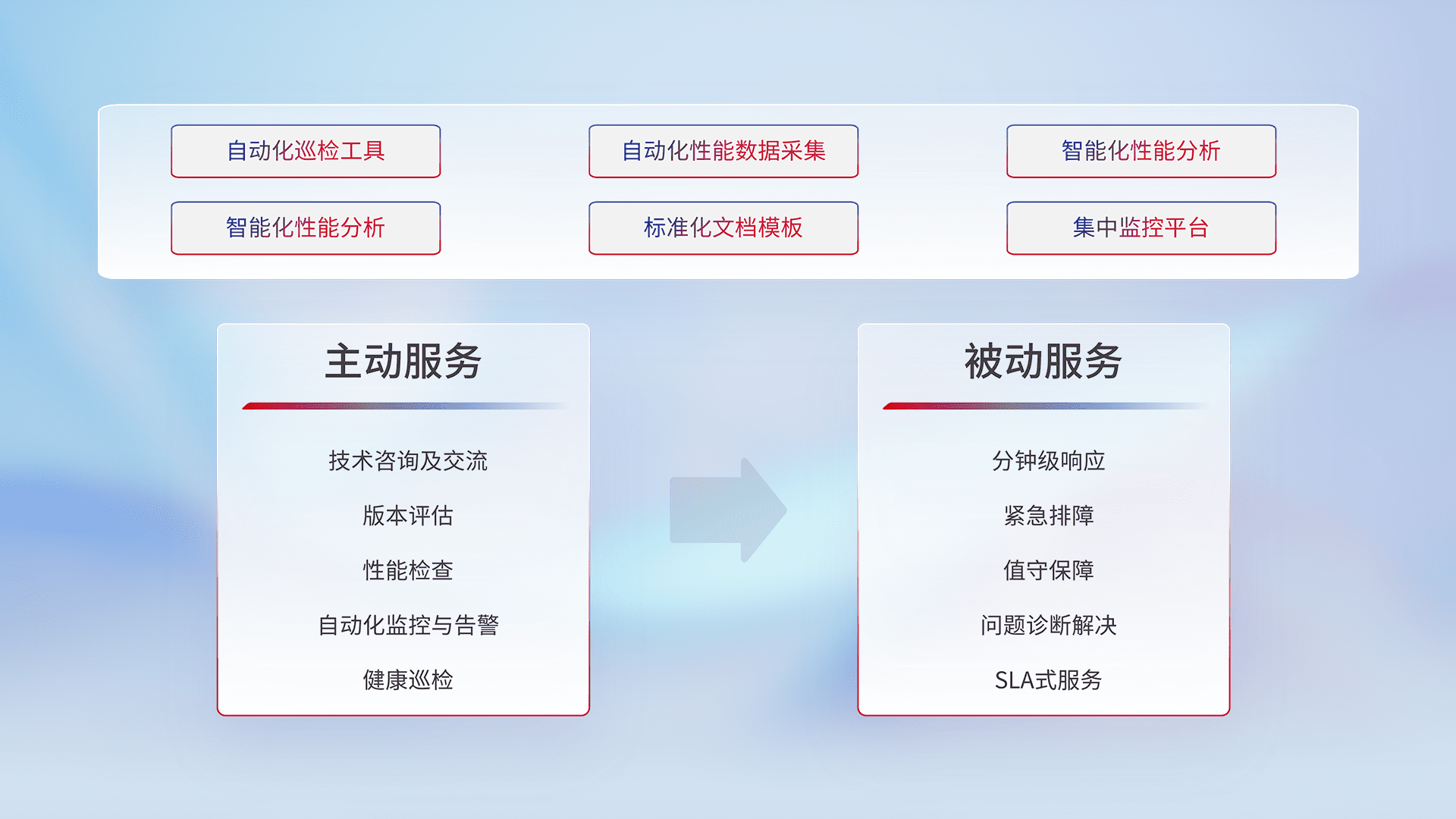 智能化工具和标准化文档,,,保障服务质量,,,,提供主动服务(包含技术咨询、、、、版本评估、、、性能检查、、、、自动化监控与告警、、、、健康巡检)和被动服务包含(分钟级响应、、、紧急排障、、、值守保障、、、问题诊断解决、、、、SLA服务)。。