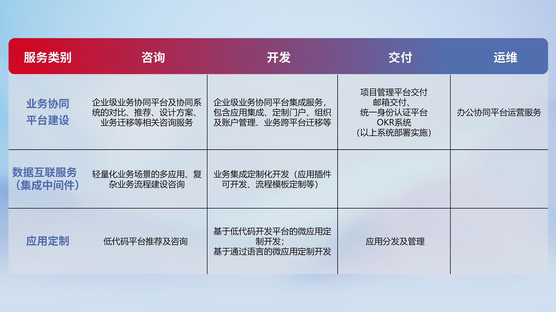 针对钉钉、、、企微、、、IDaas等平台级产品提供产品的规划、、方案、、、、交付、、、、定制化开发等服务,,,实现如统一协同办公、、智能客户服务、、混合会议管理、、、、智能数据查询、、等业务场景,,,实现数字化转型。。。。